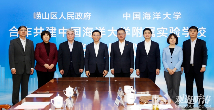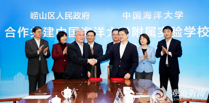 王锋、于志刚分别代表崂山区和中国海洋大学签署共建协议。张咏雁介绍了合作共建中国海洋大学附属实验学校的背景情况。