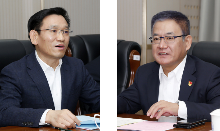 中国海洋大学党委书记田辉(左)讲话,崂山区委书记孙海生讲话