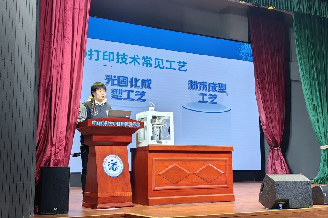 王一安和黄昊分别来自中国海洋大学海德学院和化学化工学院。两位同学向七年级学生详细介绍了3D打印技术的历史、现状和未来的发展趋势,带领同学们了解这项技术的实际应用和潜在价值。