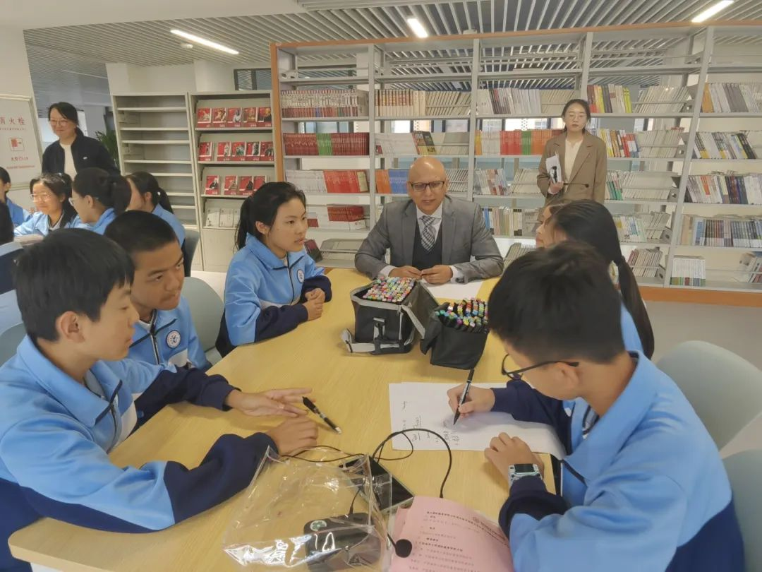 在基地揭牌仪式后,双方学生进行了跨文化语言交流活动,英语组朱文玲老师首先对海大国际教育学院的师生表示热烈的欢迎和诚挚的感谢,并对本次活动做了简单的介绍。在交流活动中,每位学生先用一分钟的时间进行自我介绍、认识彼此。接着每个小组按照自己选择或感兴趣的主题进行探讨,学生们分享自己的观点,并向自己组的交流生提出问题,深入了解他们的文化、背景和生活。同时,每个小组的成员一起合作制作了海报,以展示他们在讨论中获得的见解和体验。