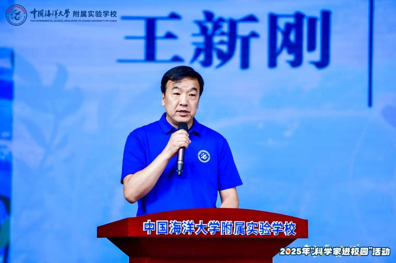活动伊始,中国海洋大学附属实验学校校长王新刚致辞。他表示,附属实验学校始终以“逐梦深蓝”为育人底色,积极响应习近平总书记“努力培养更多胸怀蓝色梦想、堪当时代重任的优秀海洋人才”的号召,持续推进科学家精神进校园,以优质资源和实践体验提升育人实效;希望此次“科学家进校园活动”能让学生近距离感受科学家精神,在心中埋下“关心海洋、认识海洋、经略海洋”的种子,成长为兼具家国情怀与海洋素养的新时代人才。